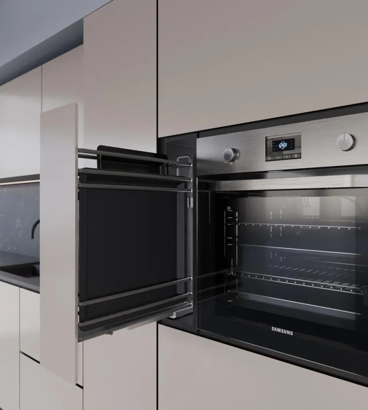 Niepowtarzalny owalny kształt drutu i zastosowane kosze z pełnym dnem podkreślają charakter każdego mebla. Solidne prowadnice typu TANDEM firmy Grass pozwalają na ciche, delikatne domknięcie a pełen wysuw carga zapewni szybki i łatwy dostęp do przechowywanych produktów.